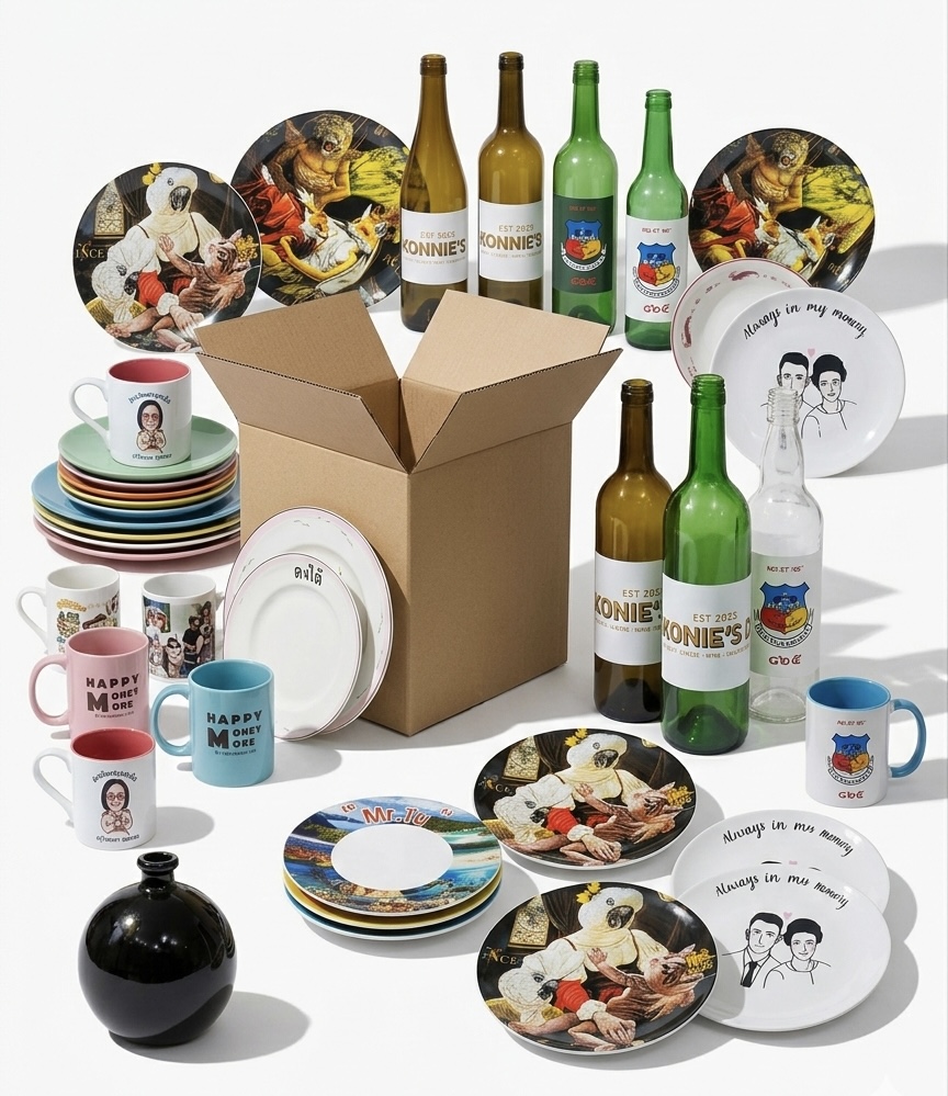 รับสกรีนเซรามิค ทั้งแก้วและจาน รับผลิตขึ้นรูปเซรามิค, ผลิตกล่องลูกฟูก, และจำหน่ายขวดแก้ว